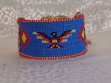 Loom beaded with glass seed beads, hand sewn onto buckskin leather, trimmed with braided leather , then completed with edge beading & leather ties.