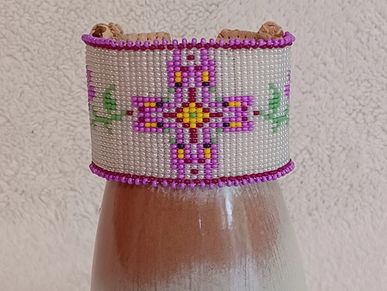 Loom beaded with glass seed beads, hand sewn onto buckskin leather with a metal clasp, then completed with edge beading.