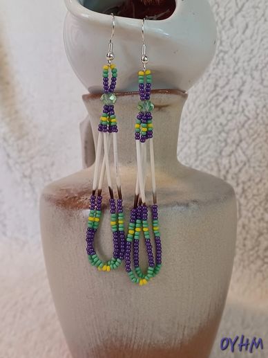 Porcupine quills beaded with glass seed beads and glass mini pony beads.