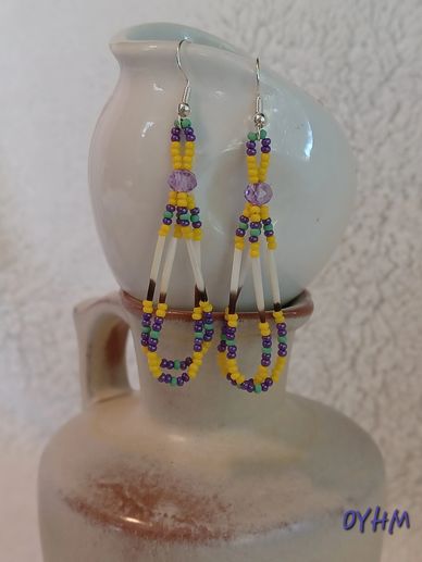 This matching set is beaded with glass seed beads in the colors of turquoise green, light purple and orange/red.
