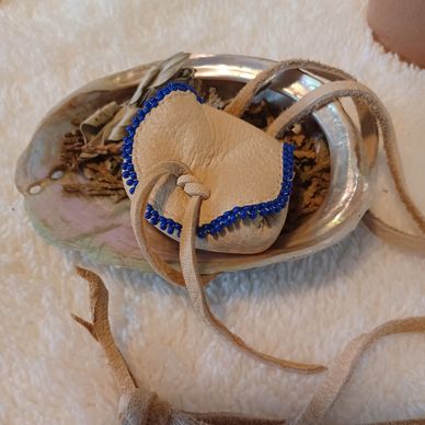 Buckskin leather beaded with glass seed beads. Measures 2"x 2" with 30" leather lacing.