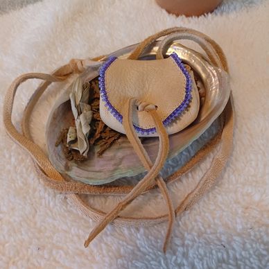 Gourd pouch/tobacco pouch necklace. Buckskin leather beaded with glass seed beads. Measures 2"x 2'"with a 30" leather lacing.